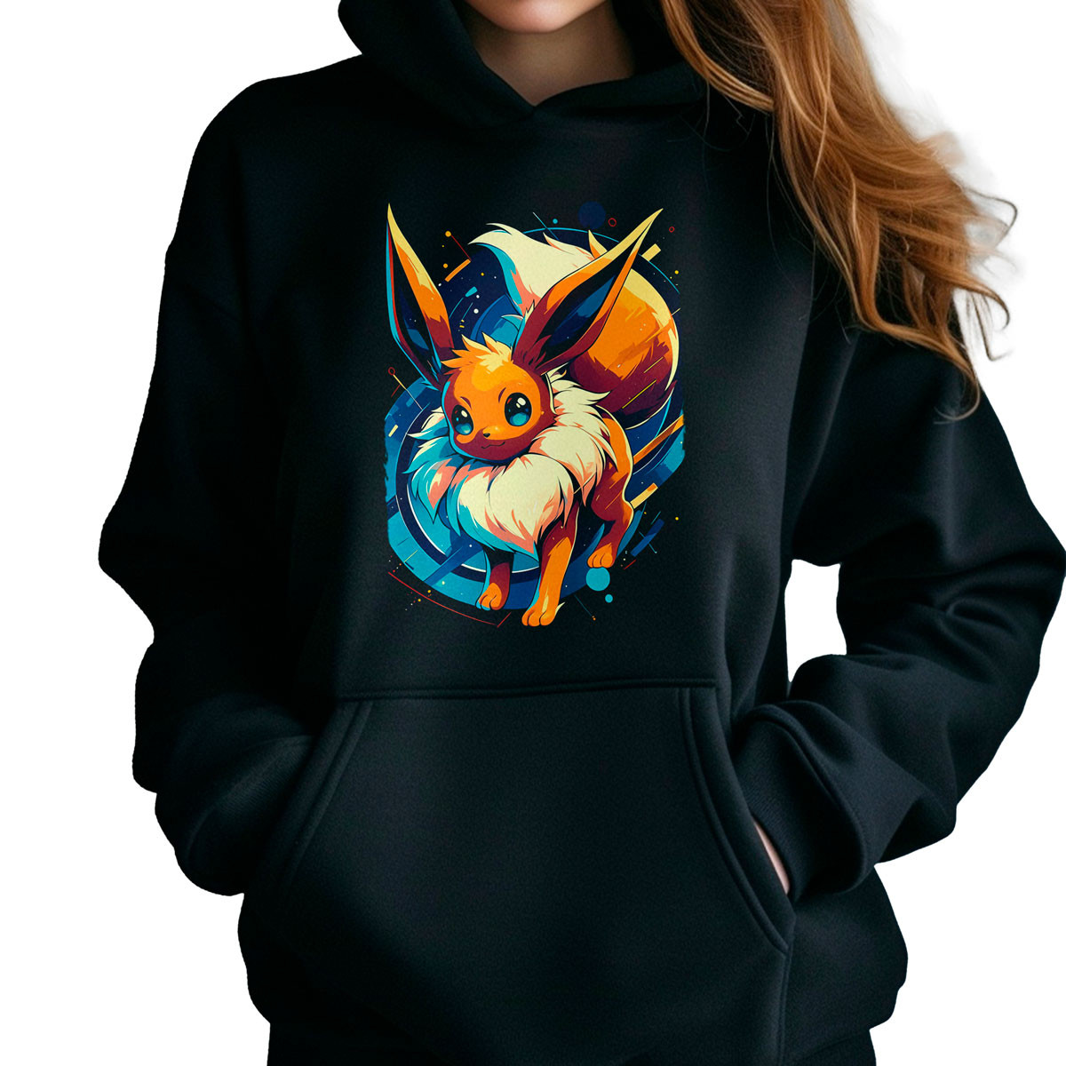 Combina la Polera Canguro Anime Eevee PokeBalls con unos jeans ajustados y zapatillas blancas para un look casual y lleno de estilo ¡Destaca tu pasión por Pokémon con este diseño único en Unika!