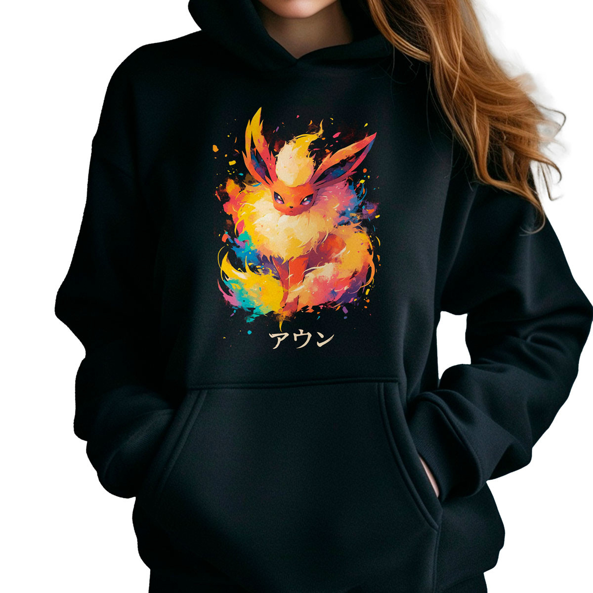 Combina la Polera Canguro Anime Flareon Ink Style con unos jeans ajustados y zapatillas blancas para un look casual y moderno ¡Destaca tu estilo con esta prenda única de Unika!
