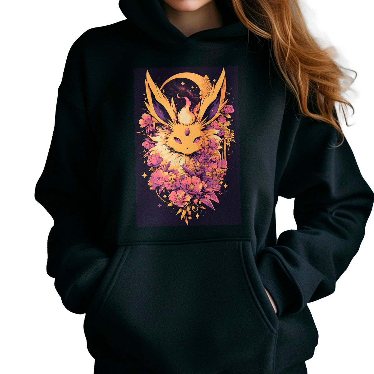 Hoodie Anime Flareon Lotus Pokemon Negro Brillante