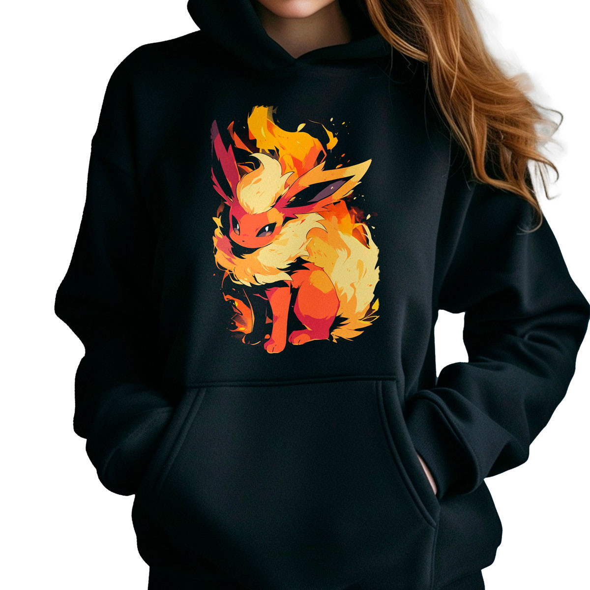 Combina la Polera Hoodie Anime Mujer Diseño Flareon Pokemon Negro con unos jeans ajustados y zapatillas blancas para un look casual y lleno de estilo Añade una chaqueta de cuero para un toque más rockero ¡Impacta con tu outfit!