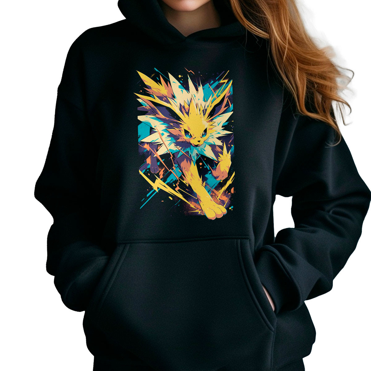 Para combinar la Polera Hoodie Anime Mujer Jolteon cherry blossoms, puedes crear un look casual y moderno combinándola con unos jeans ajustados y zapatillas blancas Agrega unos accesorios sencillos para resaltar el diseño de la Polera