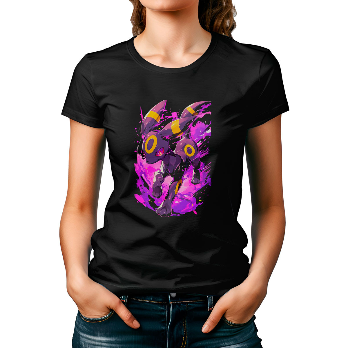 Combina la Polera Mujer Umbreon Vmax Pokemon Anime con unos jeans ajustados y zapatillas blancas para un look casual y lleno de estilo Completa tu outfit con una chaqueta de cuero para un toque más urbano ¡Marca tendencia con Unika!