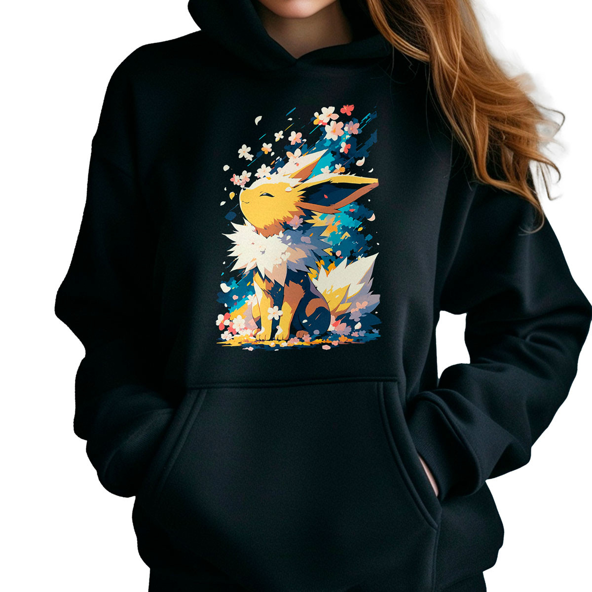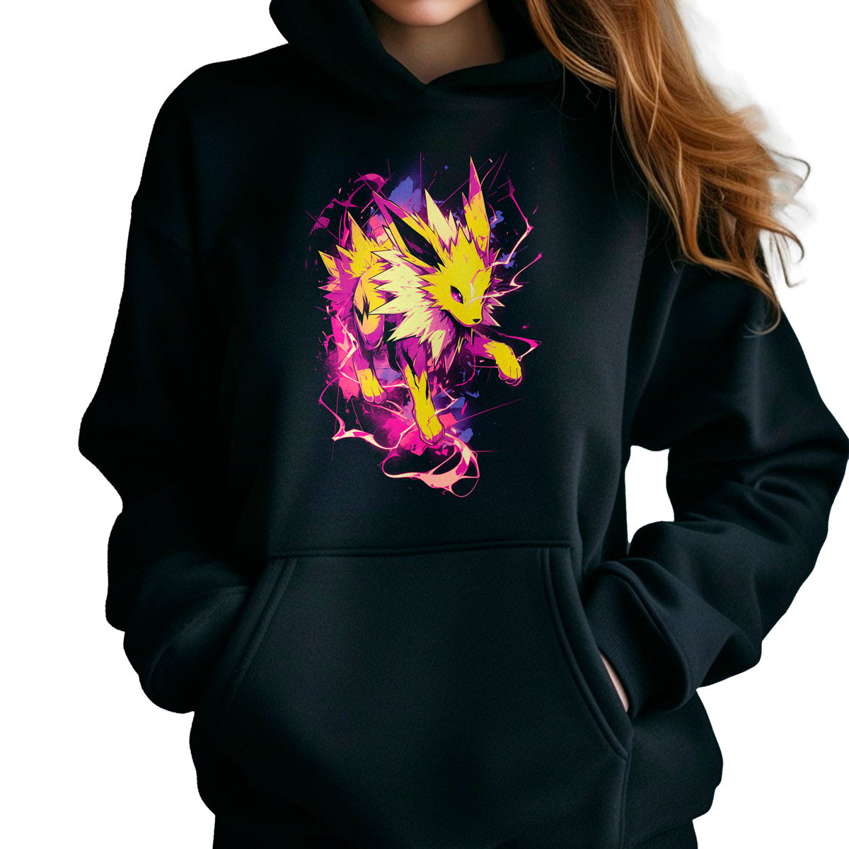 Para un look impactante, combina los Polerones Anime Jolteon Discharge con unos jeans ajustados y zapatillas blancas ¡Destaca tu pasión por los animes con estilo y originalidad!
